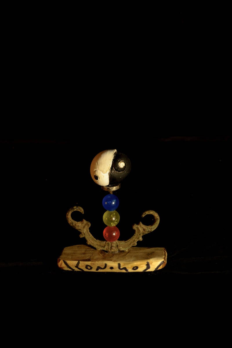 Een oude klink van een kastdeurtje op een houten plankje met een verroeste nagel en gekleurde knikkers en daarbovenop 2 slakkenhuisjes samen als yinyang teken