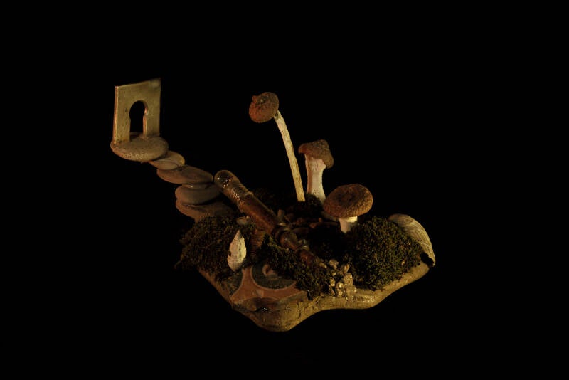 Een miniwereldje op een steen gebouwd met een scharnier en kapot lampje als verrekijker, een stenen trapje met een soort sleutelgat en beenderen met eikeldopjes als paddestoelen.